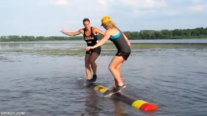 Curiosa competición de equilibrio sobre un tronco rodante que flota
